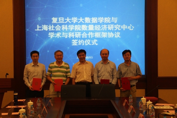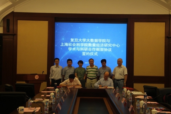 2017年9月5日,复旦大学大数据学院与上海社科院数量经济研究中心签约仪式在复旦大数据学院举行。复旦大学大数据学院、大数据研究院院长范剑青教授及其有关教授、研究人员与研究生近15余人,上海社科院研究生院院长、院数量经济研究中心主任朱平芳教授,上海社科院经济所统计与数量经济研究室主任、院数量经济研究中心副主任韩清教授,上海社科院经济所统计与数量经济研究室与院数量经济研究中心高级顾问姜国麟教授以及数量经济研究中心相关人员、研究生12人出席了此次签约仪式。