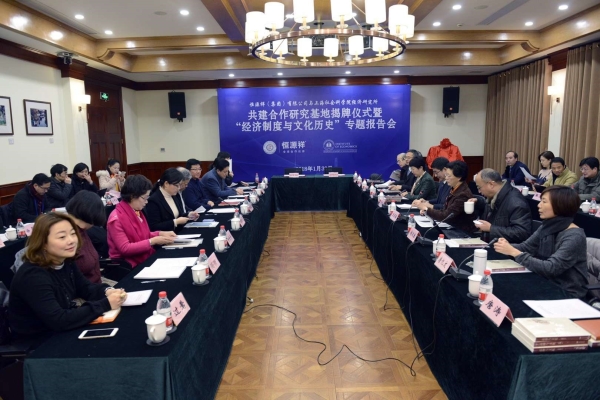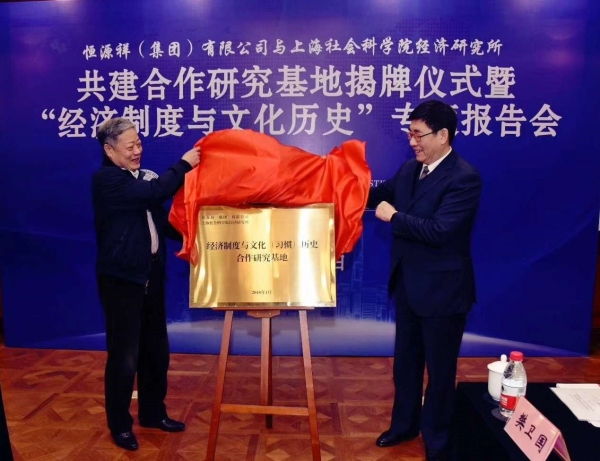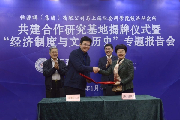 2018年1月30日上午,经济研究所与恒源祥(集团)有限公司举办共建合作研究基地揭牌仪式暨“经济制度与文化历史”专题报告会。院党委书记于信汇出席会议并致辞,恒源祥(集团)有限公司党委书记、董事长刘瑞旗致辞并作“经济制度与文化历史”专题报告。双方书记共同为合作研究基地揭牌,经济研究所所长沈开艳、恒源祥(集团)有限公司总经理陈忠伟分别代表双方在合作协议书上签字。院党委副书记王玉梅主持仪式。