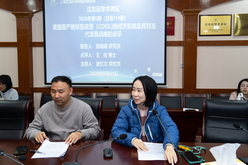 2026年3月31日上午,2026年度第5期(总第119期)“沈志远学术讲坛”在经济研究所503会议室举行。本所开放经济学研究室张晓娣研究员作了题为“标签之下的壁垒:美国原产地标签政策(COOL)的经济影响及其对当代贸易战略的启示”的学术报告。本次报告由唐忆文研究员主持,王佳博士点评。